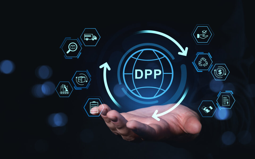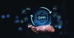 Digital product passport concept with icons floating above a hand on dark background. door Ellen | feb 24, 2026
