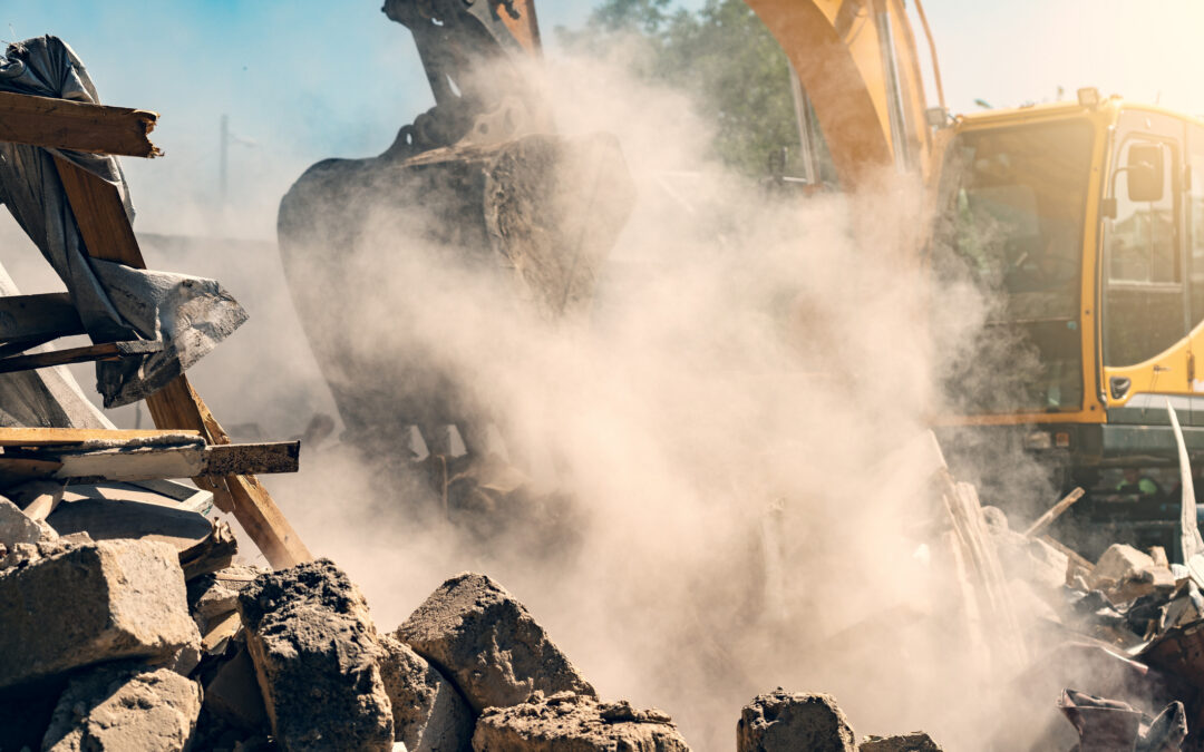Process of demolition of old building dismantling. Excavator breaking house. Destruction of dilapidated housing for new development